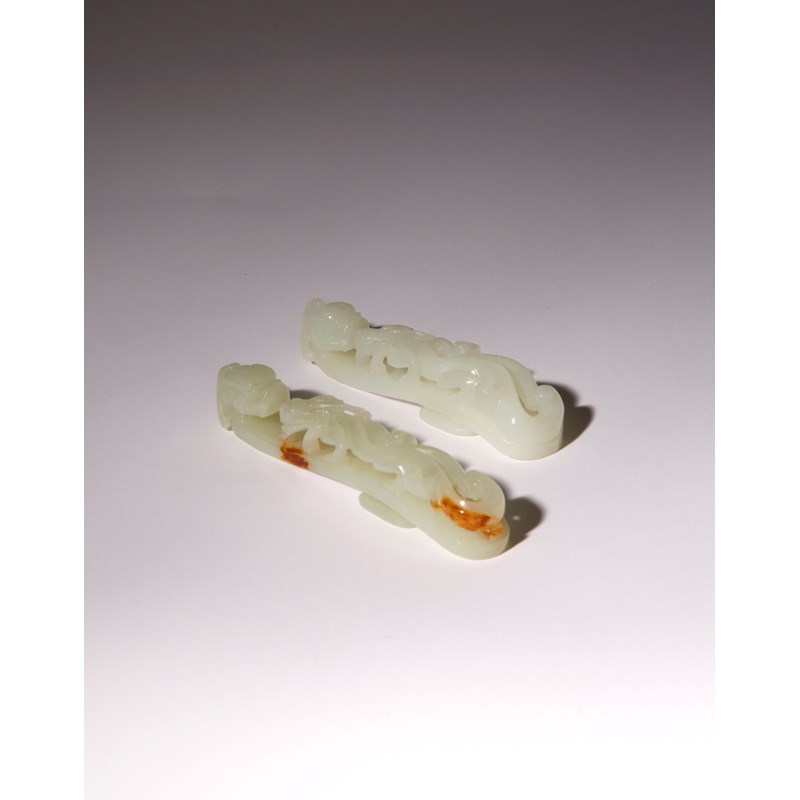 Both carved with a dragon's head terminals, and with chilong to the shafts, 12.2cm and 10.5cm. (2)