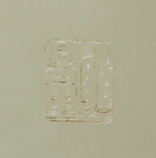 With rounded edges and carved in relief with a stylised dragon band, the base with a two character seal mark, 6cm.