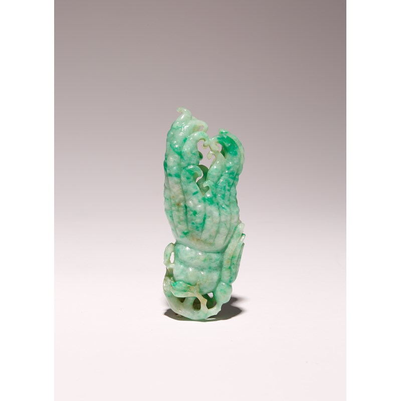 Naturalistically carved with a large and a small fruit issuing from a leafy stalk, the stone with apple green inclusions, 11cm.