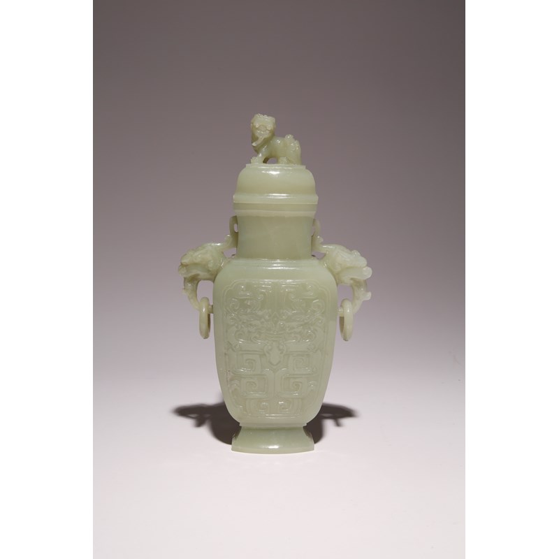 A CHINESE PALE CELADON JADE ARCHAISTIC VASE AND COVER