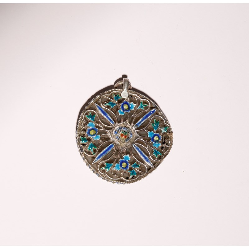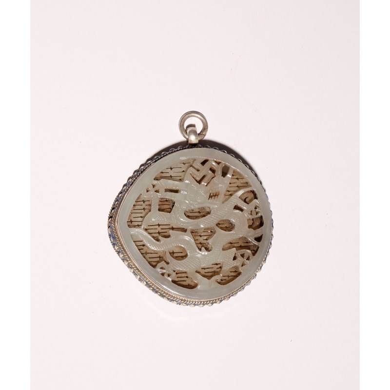 Carved with a scaly dragon, and mounted within an enamelled metal floral pendant, 6cm.