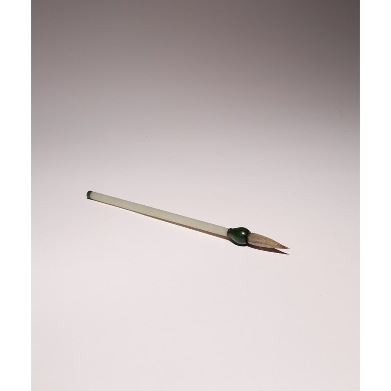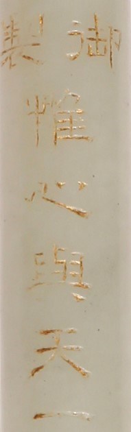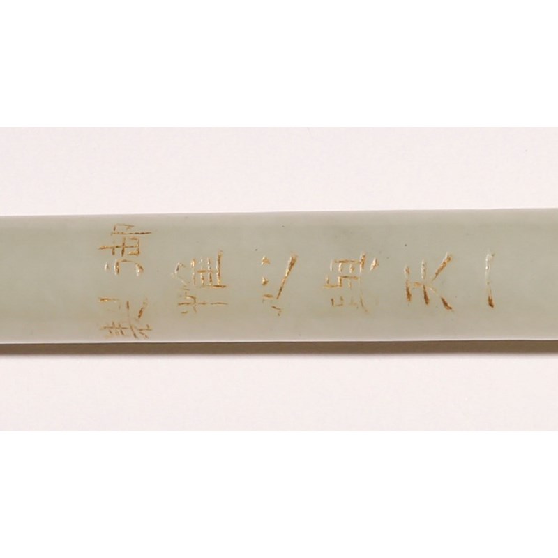 Each end mounted in spinach jade, the shaft with a seven character inscription detailed in gold, 25.5cm.