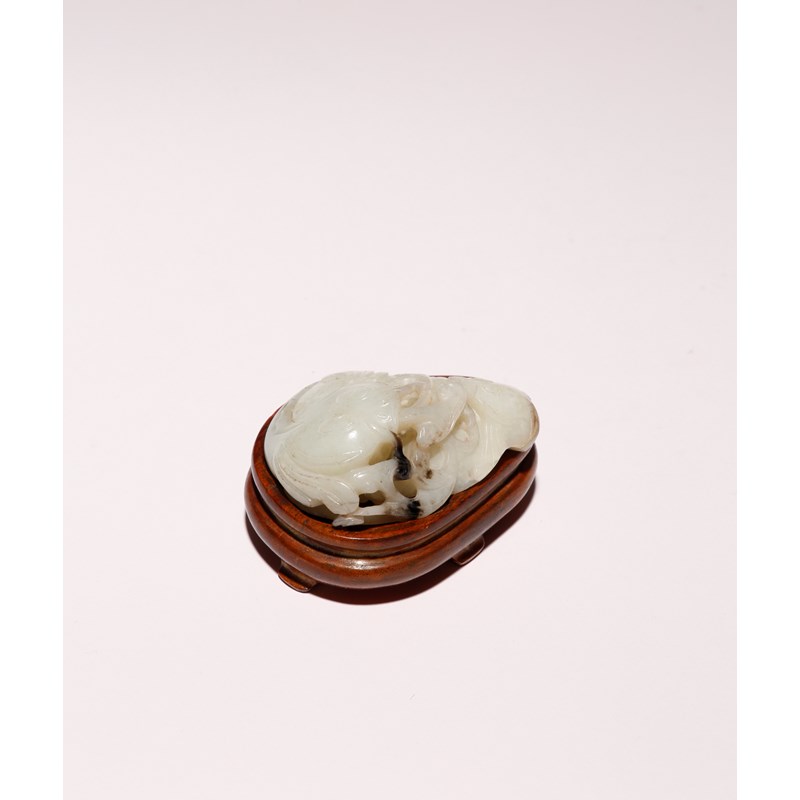 Carved and pierced with the fish entangled in a spray of lingzhi, the mottled pale celadon stone with black and russet inclusions, a wood stand, 6.3cm. (2)