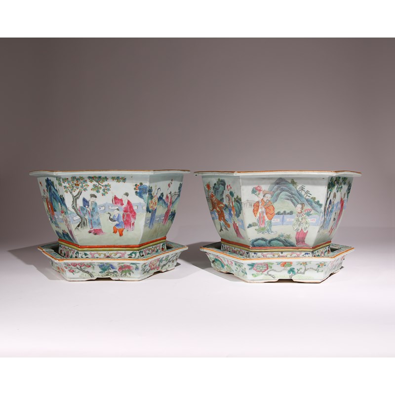 A PAIR OF CHINESE FAMILLE ROSE HEXAGONAL JARDINIERES AND STANDS