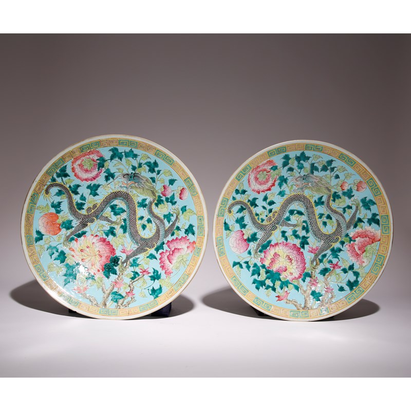 Each brightly painted with a scaly dragon to the centre, surrounded by blossoming peonies and leafy branches, encircled by key fret bands to the rims, each with the underside decorated with three sprays of bamboo, 40.5cm. (2)
