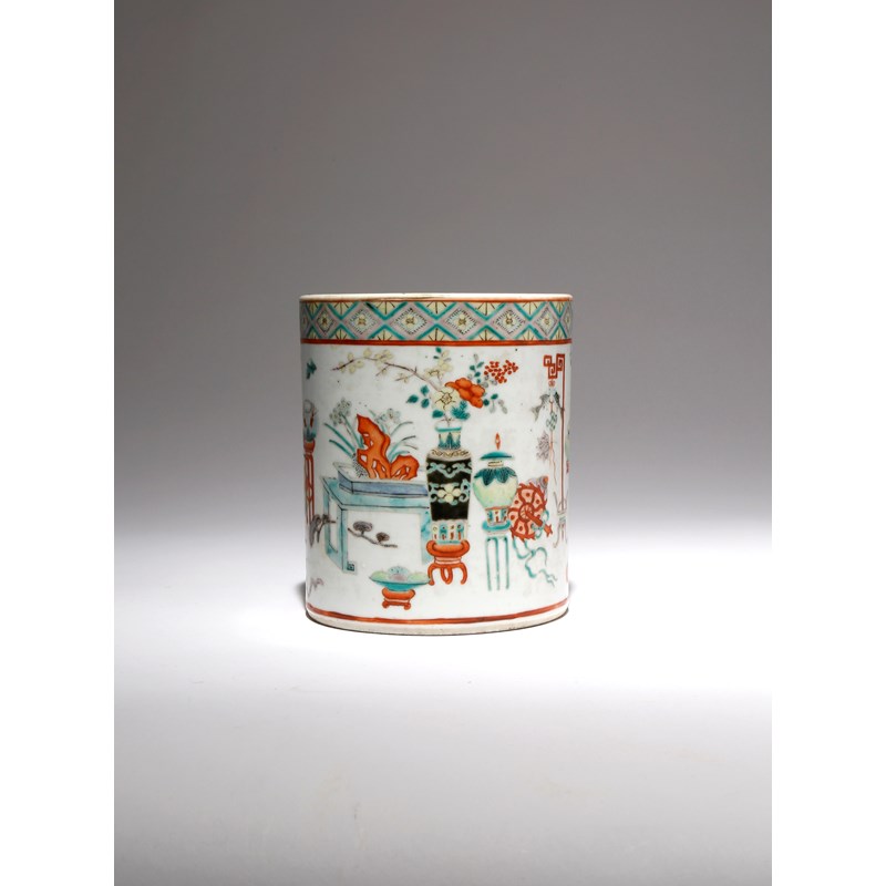 A CHINESE FAMILLE VERTE 'HUNDRED ANTIQUES' BRUSHPOT, BITONG