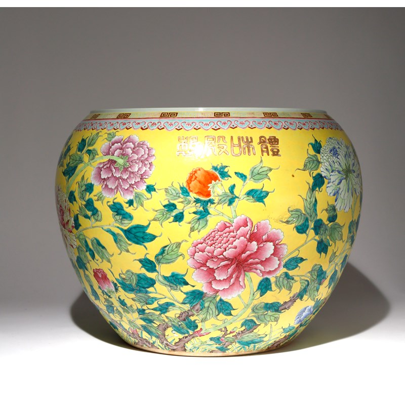 Painted with a continuous scene of large flowering peony blooms, with four gilt characters reading Ti He Dian zhi (made for The Hall of Harmonious Conduct), with bands of ruyi-heads and key fret encircling the rim, all reserved on a bright yellow ground, 53cm dia.