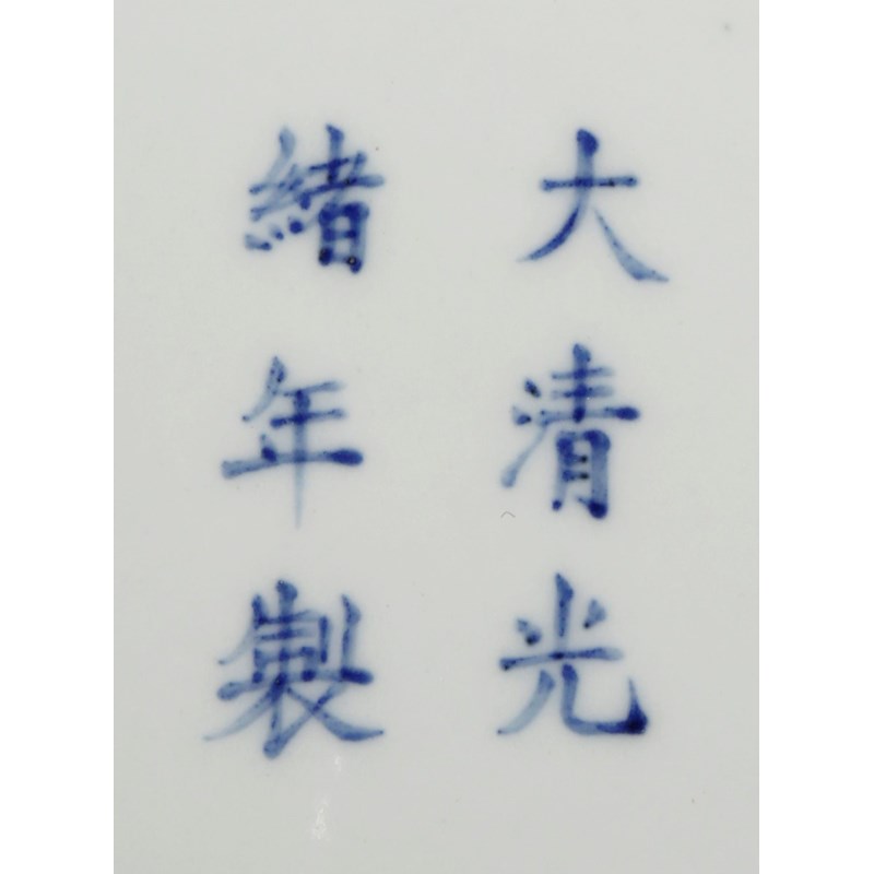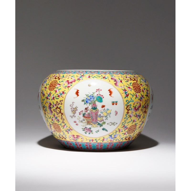Painted with four roundels enclosing flowers, fruits and precious objects, all reserved on a yellow ground decorated with bats, peaches and shou medallions, with a six character Guangxu mark to the base, 30cm dia.