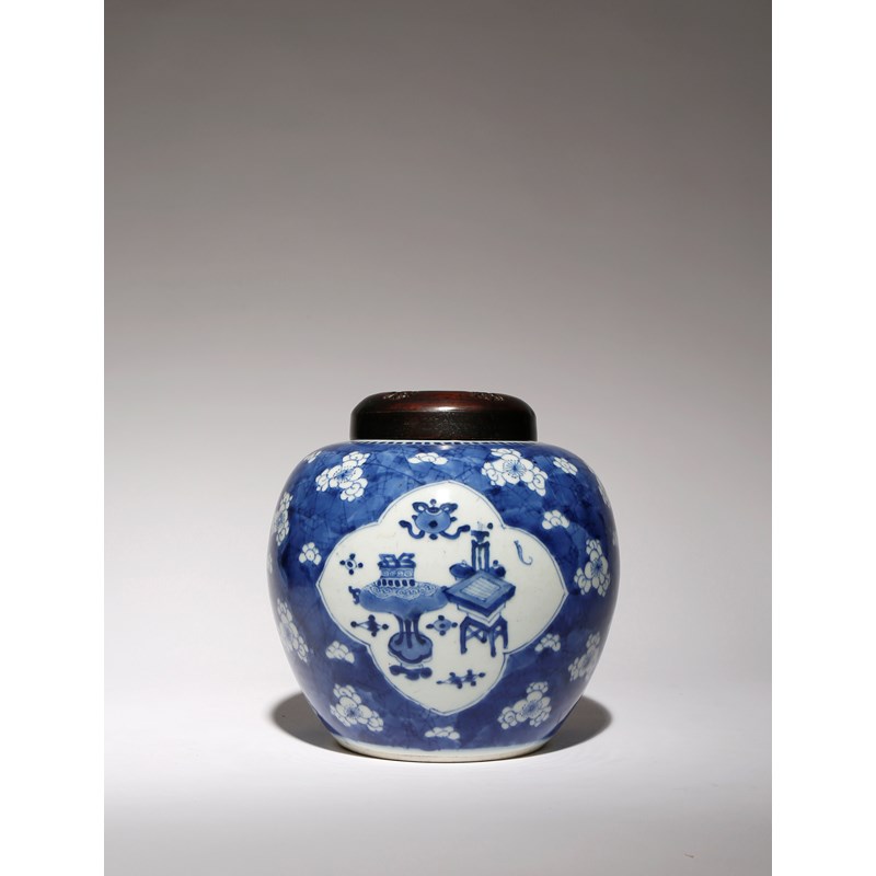 Painted with three quatrefoil cartouches containing archaistic vessels, peacock plumes, a qin and beribboned precious objects, all reserved on a prunus-decorated cracked-ice ground, with double rings to the base, together with a wood stand pierced with shou characters, 19.8cm. (2)