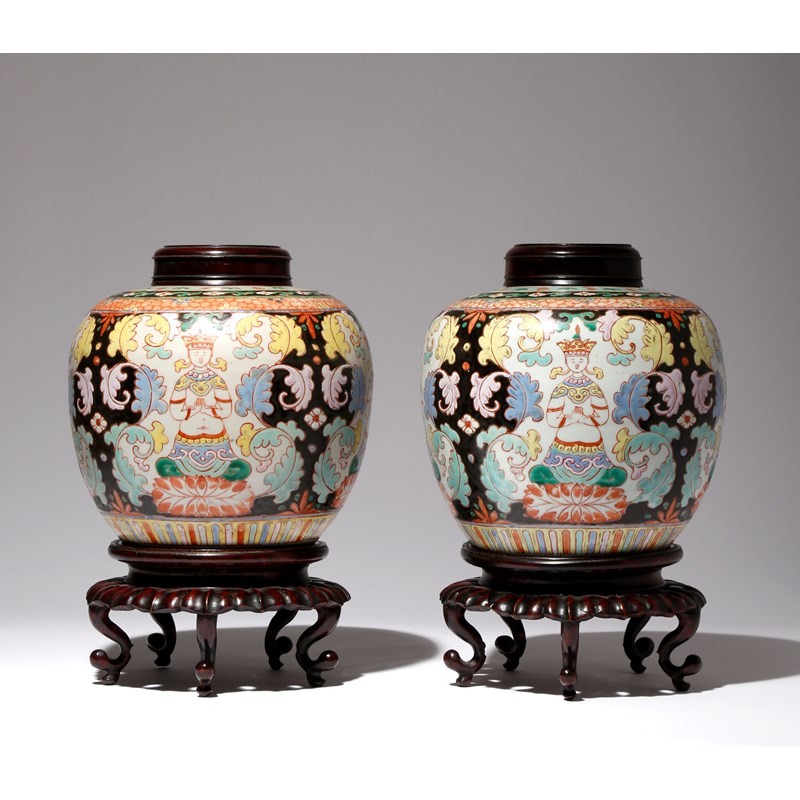 Each painted with four figures of Buddha seated upon a large lotus base with his hands held together in prayer, the panels divided by furling leaves and blossoms on a black ground, with underglaze blue rings to the bases, each together with a pierced wood cover and a wood stand raised on five tall S-shaped feet, 20.6cm. (6)