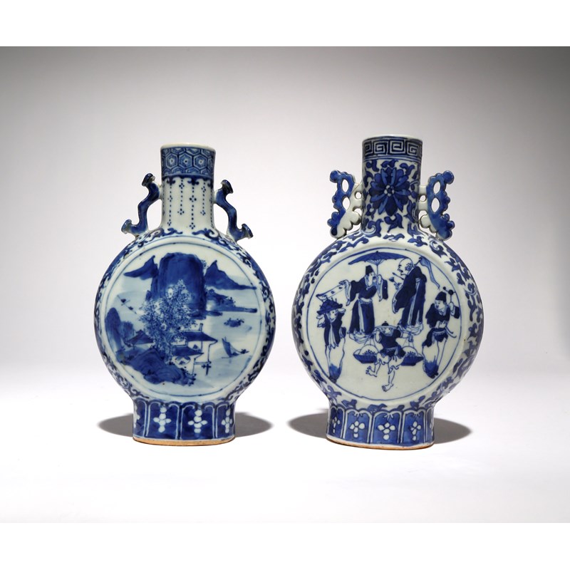 One painted with medallions enclosing figures, the other decorated with roundels containing mountainous riverscapes, with scrolling flowers surrounding the designs, each with two applied handles to its tall cylindrical neck, the smaller flask with a four character Kangxi mark, 21.8cm and 21cm. (2)