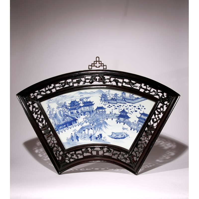 A CHINESE BLUE AND WHITE FAN-SHAPED 'LANDSCAPE' PLAQUE