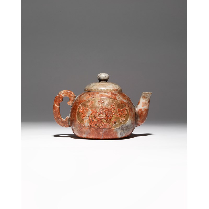 A CHINESE SOAPSTONE TEAPOT AND COVER