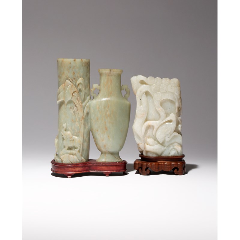 The conjoined vase carved as a cylindrical vessel attached to a flattened two-handled vase raised on a flared foot, the cylindrical body decorated with an elephant beneath a plantain tree, the greyish stone with russet inclusions, the body of the white brush holder formed as bamboo, decorated in relief with an insect, frog and crane in a rocky landscape amidst pine and lingzhi, the pale greyish-white stone with some black flecks and russet markings, each together with a wood stand, 17.5cm and 14.3cm. (4)