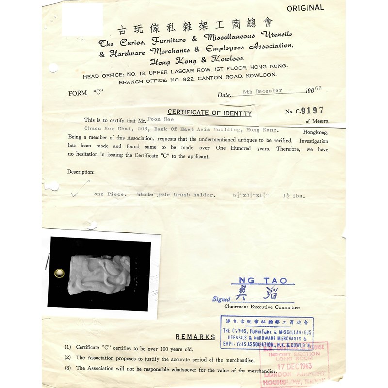 Provenance: formerly a private collection, London, formed c.1959-1963. Both purchased from Chuen Koo Chai Dealers in Ancient Chinese Arts & Curio, Hong Kong. The conjoined vase purchased on 16th November 1955. The white brush holder acquired on 4th December 1963. Copies of the invoices are available. A certificate of identity for the white brush holder dated 6th December 1963 from The Curios, Furniture & Miscellaneous Utensils & Hardware Merchants & Employees Association, Hong Kong & Kowloon, is also available. Lots 79-84 and 692-694 are all from the same collection.