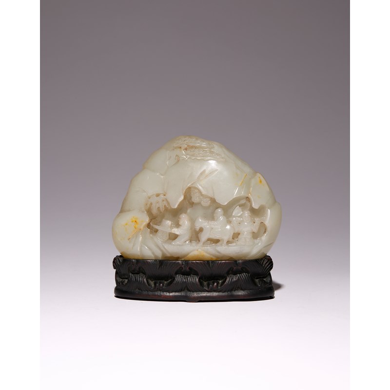 Carved with figures on a rocky mountain path, one rides a mule as the others transport goods, worked with a mountain range to the reverse, the greyish stone with russet markings, together with a wood stand, 11.5cm. (2)