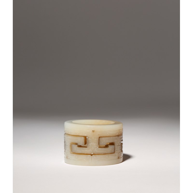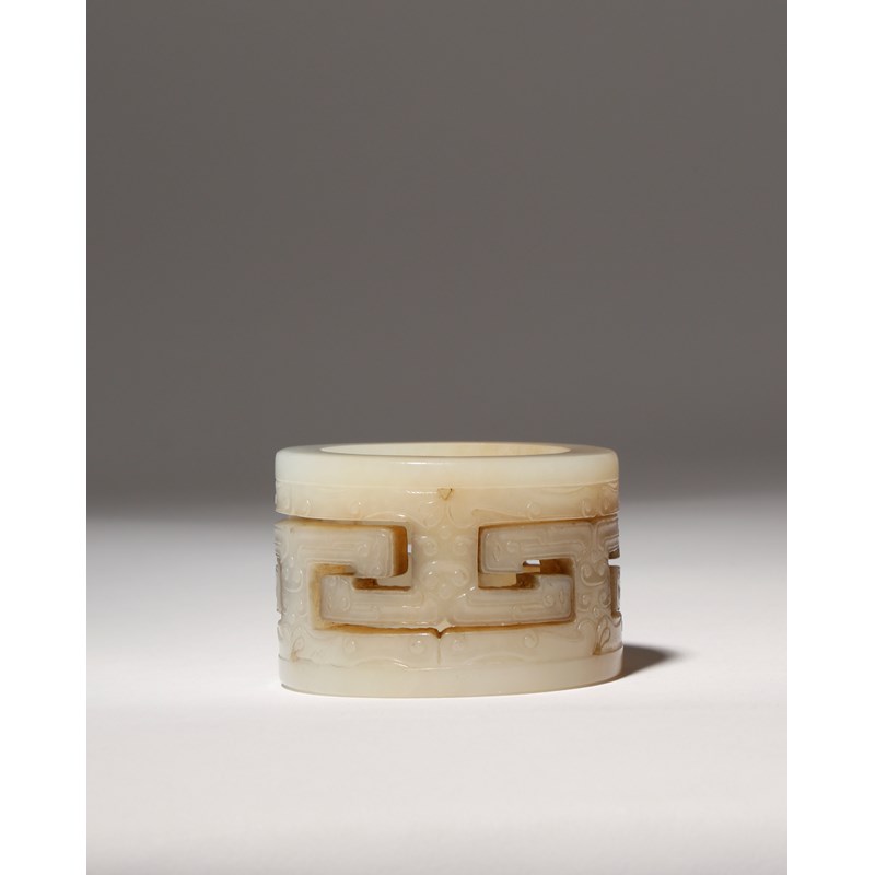 Carved in openwork with an interlocking design of 'T' scrolls, the exterior decorated in low relief with archaistic scrolls, the stone with light brown inclusions, 5.5cm.