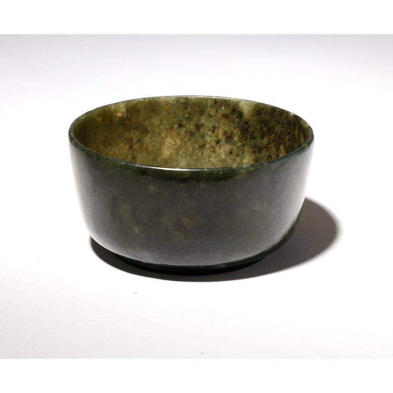The deep bowl carved with straight sides, all raised on a short circular foot, the dark green stone with some pale inclusions and black speckling, 12.1cm.