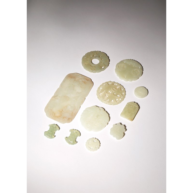 Variously carved and pierced with figures, characters, butterflies, bats, bamboo and other designs, the pieces worked in celadon, pale celadon and white jade, together with a pair of small bowenite pendants, 10.9cm max. (11)
