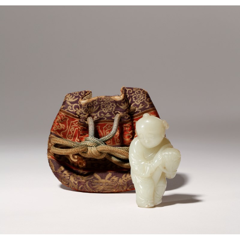 Carved as a young boy riding a hobby horse, bearing a cheerful expression on his face, with his hair tied in three buns, with two holes for suspension to the reverse, the stone of an even tone with some minor inclusions, together with a silk pouch, 7.3cm. (2)