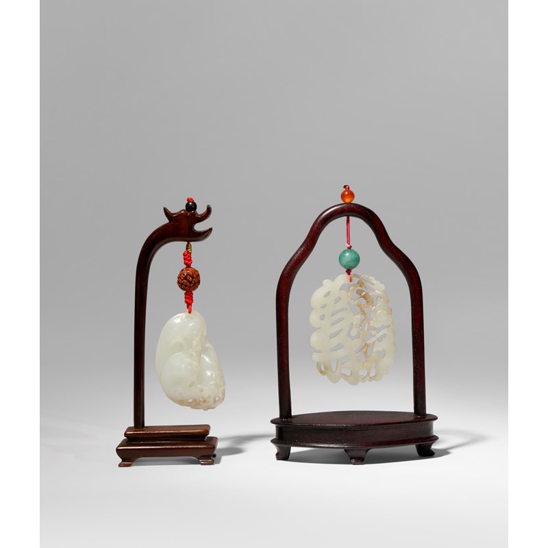 One formed as three seed pods issuing from a leafy branch, with slender vines trailing over the bodies, the other carved in openwork with blossoming prunus and a stylised character, each suspended from a wood stand with cord, the pendants 6cm and 6.4cm. (2)