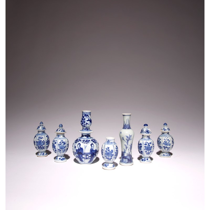 SEVEN MINIATURE CHINESE BLUE AND WHITE VASES