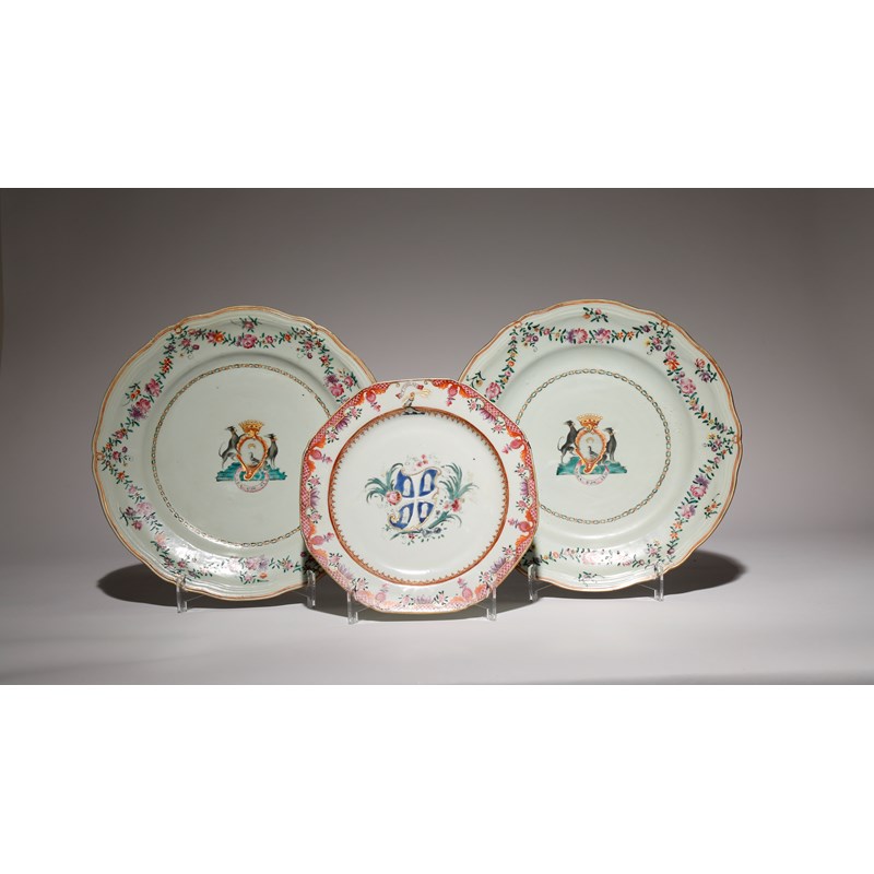 THREE CHINESE FAMILLE ROSE ARMORIAL PLATES