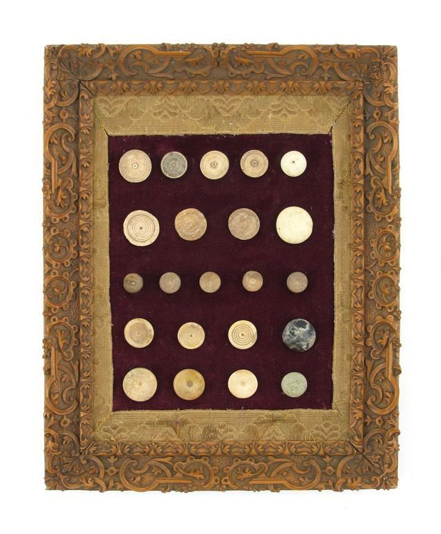 Twenty two Roman gaming counters, mounted within an elaborately carved hardwood frame, 29cm.