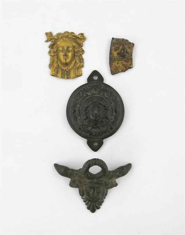 four small bronze items, all cast with face masks, Roman and later, 9.5cm. (4)