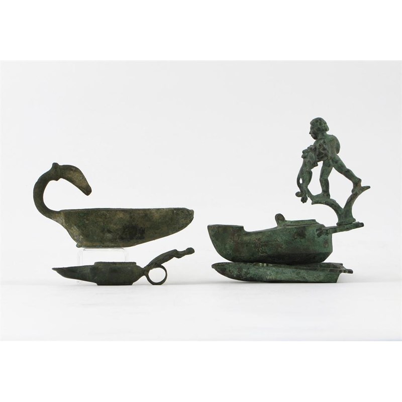 Three bronze oil lamps, and another component from a lamp, Roman and probably later, damages and losses, 17cm max. (4)