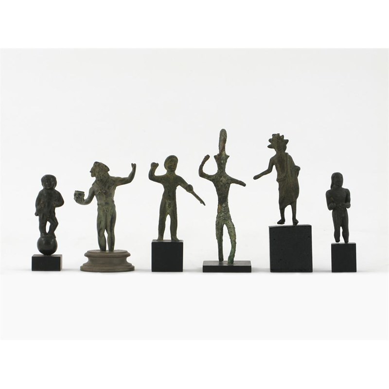 Six small bronze figures, two of Hercules, one model of Eros and another of an Etruscan warrior, some damages, 12.5cm max. (6)
