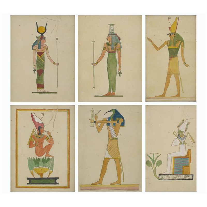 Six watercolour drawings, depicting Egyptian gods, 20th century, 32cm and 20.5cm, and a photographic print of a bust of Queen Nefertete, old wear and damages. (7)