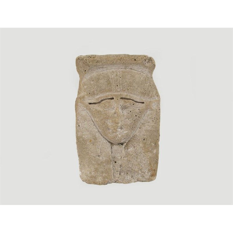 An Egyptian limestone plaque of the head Hathor, the reverse carved with a bird, c.600 BC, 9cm.