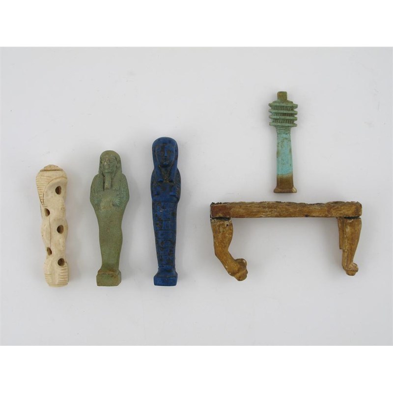 Two Egyptian ushabti, one in green faïence the other a blue glass figure together with a carved ivory handle, a small wooden table or stand and a turquoise glazed model of a pillar, damages, 13cm max. (5)