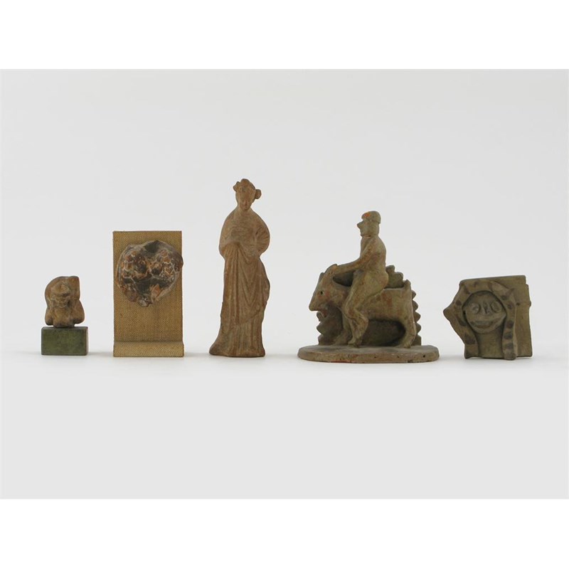 A pottery model of a female figure, wearing flowing robes together with four other pottery items, some pieces fragments, others with damages, 14cm max. (4)