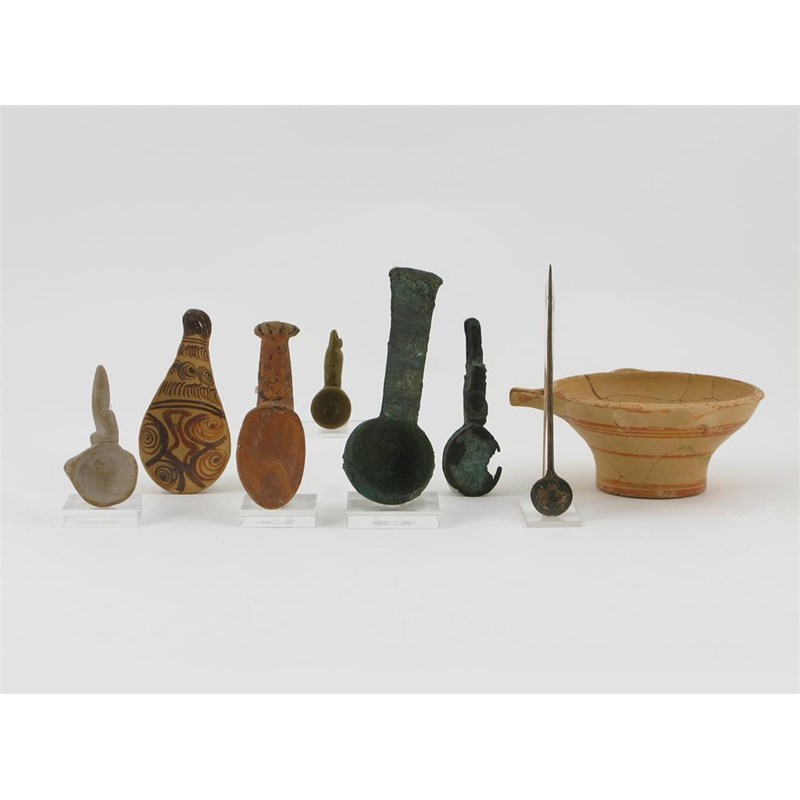 Seven various spoons in pottery, bronze and stone, and a bowl with a pouring lip, probably Cypriot, old wear and damages, 14.5cm max. Four with modern perspex stands. (8)