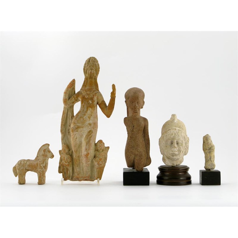 A Roman pottery model of Aphrodite, together with a pottery model of a horse, a plaster model of a head, a crouching pottery figure and a red resin Egyptian figure, 32.5cm. (4)