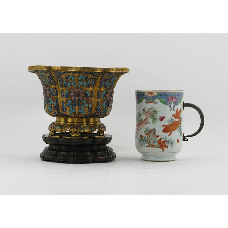 A Chinese gilt metal and enamel jardinière, the six-lobed form enamelled with stylized lotus in shades of blue, pink and red, attached to a later hardwood lotus stand, and a large porcelain mug painted with carp, 18th century, damages, the mug with a replacement metal handle, 26.5cm max. (2)