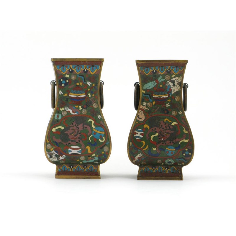 A pair of Chinese cloisonné square-section vases, decorated with dragons, Buddhist lions and auspicious symbols, 19th/20th century, 20cm. (2)