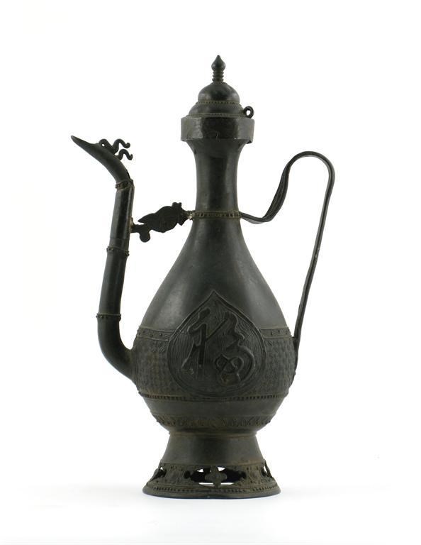 An unusual Chinese bronze ewer and cover, of Islamic form, the pear-shaped body cast with fu and shou characters within peach-shaped panels on a wide band of cash, the flared foot with four reticulated floral panels, Ming dynasty, 16th/17th century, old repairs, 45.5cm. (2)