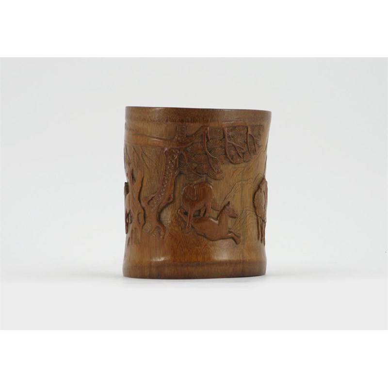 A Chinese bamboo brush pot, carved with the Eight Horse of Mu Wang, with mountains and pagodas beyond, 19th/20th century, 14.5cm.