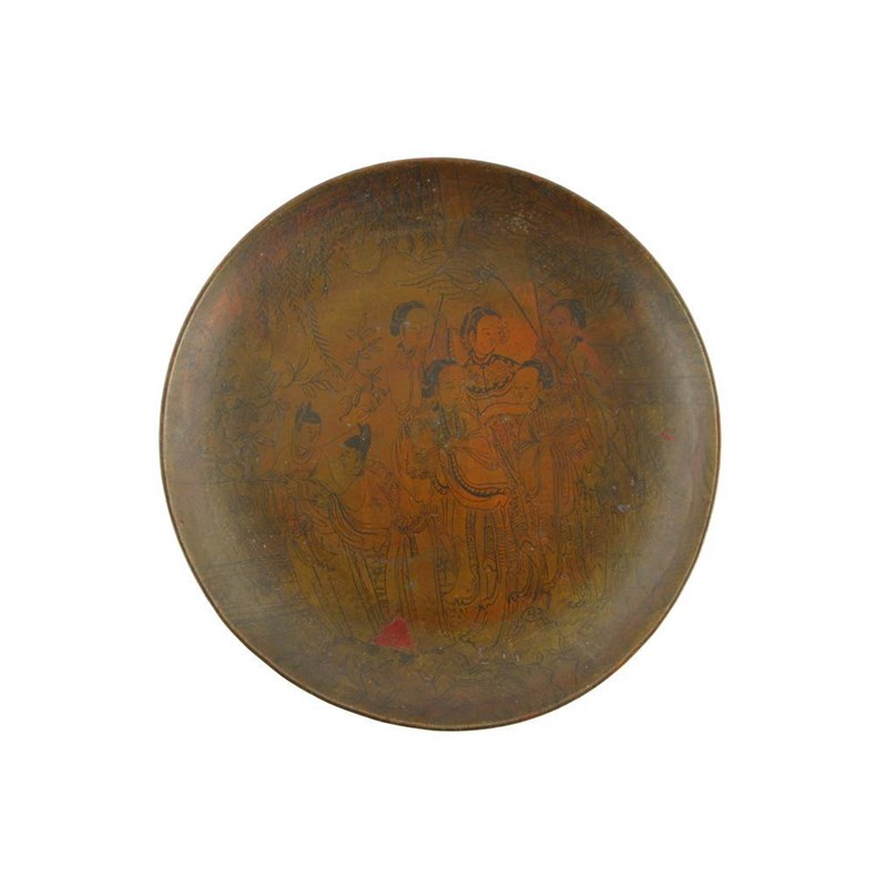 A Chinese lacquered shallow dish, finely painted with seven maidens on a terrace beneath leafy trees, finely drawn in black on a green-brown ground, 1st half 19th century, minor damage, 21.7cm.