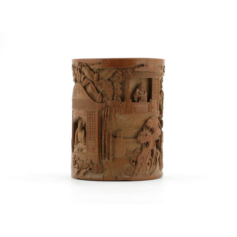 A Chinese bamboo cylindrical brush pot, carved with two figures beneath a pine tree and further figures at windows, amidst rocks, bamboo and a maple tree, the reverse with a three character inscription, 16cm.
