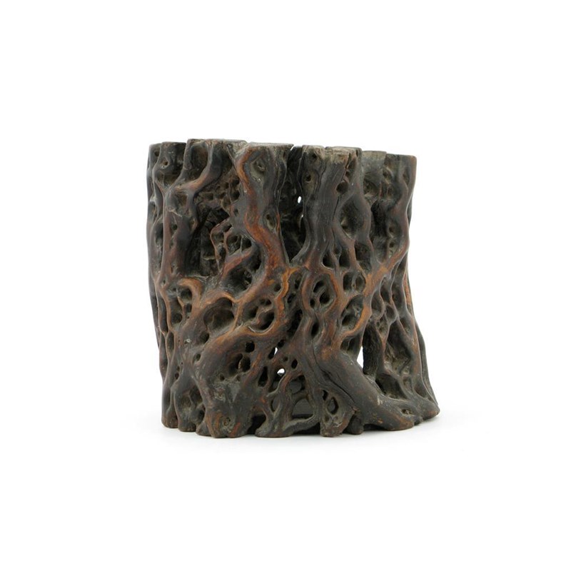 A large rootwood brush pot, the sides naturally reticulated, 17th century or later, 21.5cm.