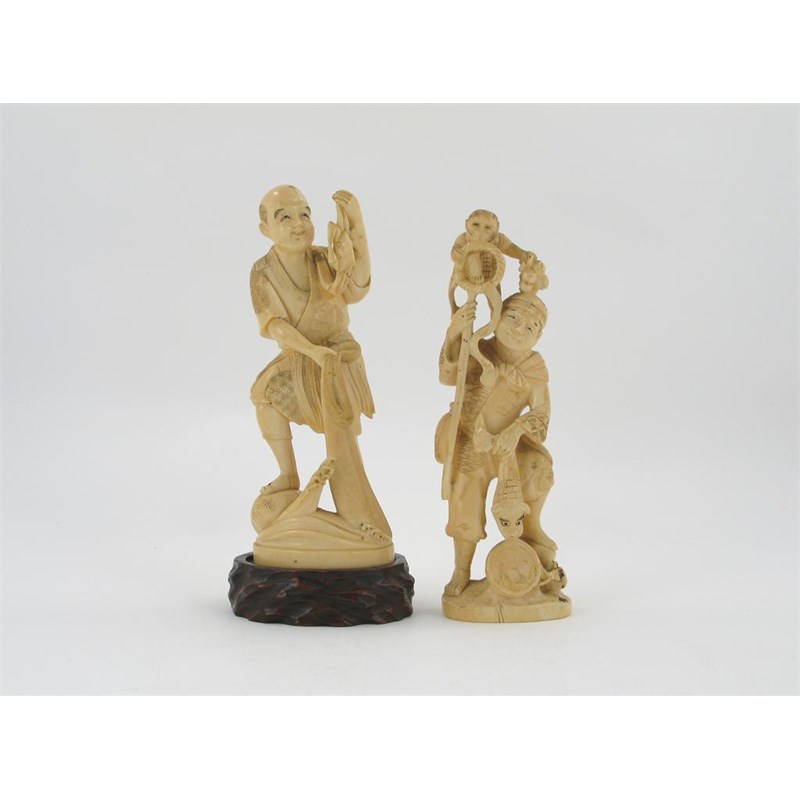 Two Japanese ivory figures, one a fisherman holding a crab, the other with a monkey on his shoulder, Meiji 1868-1912, 19.5cm max. One with a wood stand. (3)