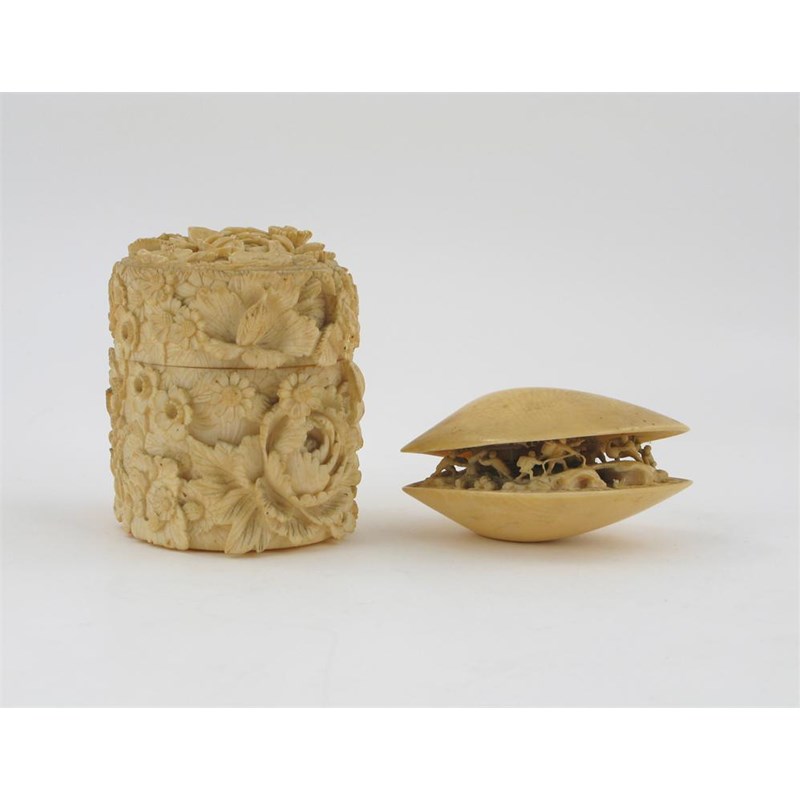 A Japanese ivory carving of a clam's dream, depicting many small figures, and an ivory box and cover carved with many flowers, both signed, 19th century, 9.5cm max. (3)