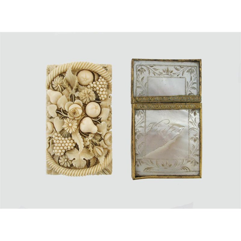 A mother of pearl and gilt metal card case, inscribed 'Visites' and a rectangular box and cover elaborately carved as a basket of fruit and flowers, both 19th century, minor damages, 9.5cm. (4)