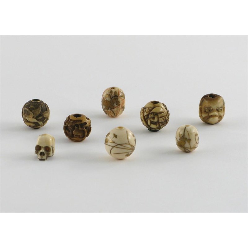 Eight bone and ivory ojme, variously decorated with horses, figures in landscapes, geese, gold lacquer, a face and a skull, 18th/19th century, 1.3cm max. (8)