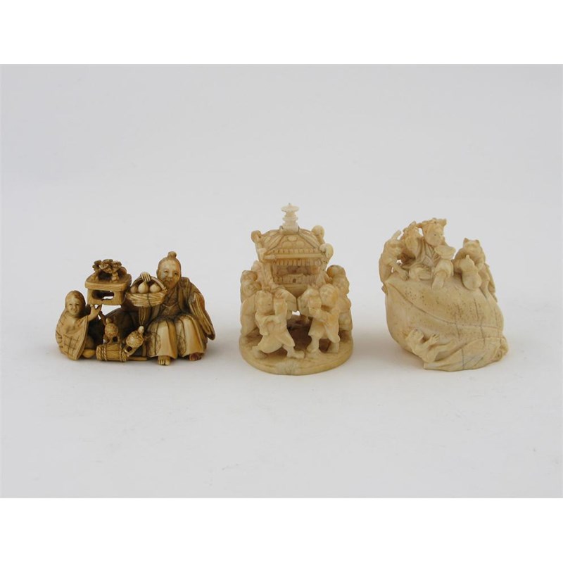 Three small Japanese ivory carvings, depicting figures in various pursuits, two with signatures, 19th century, damages and repairs, 5.5cm max. (3)