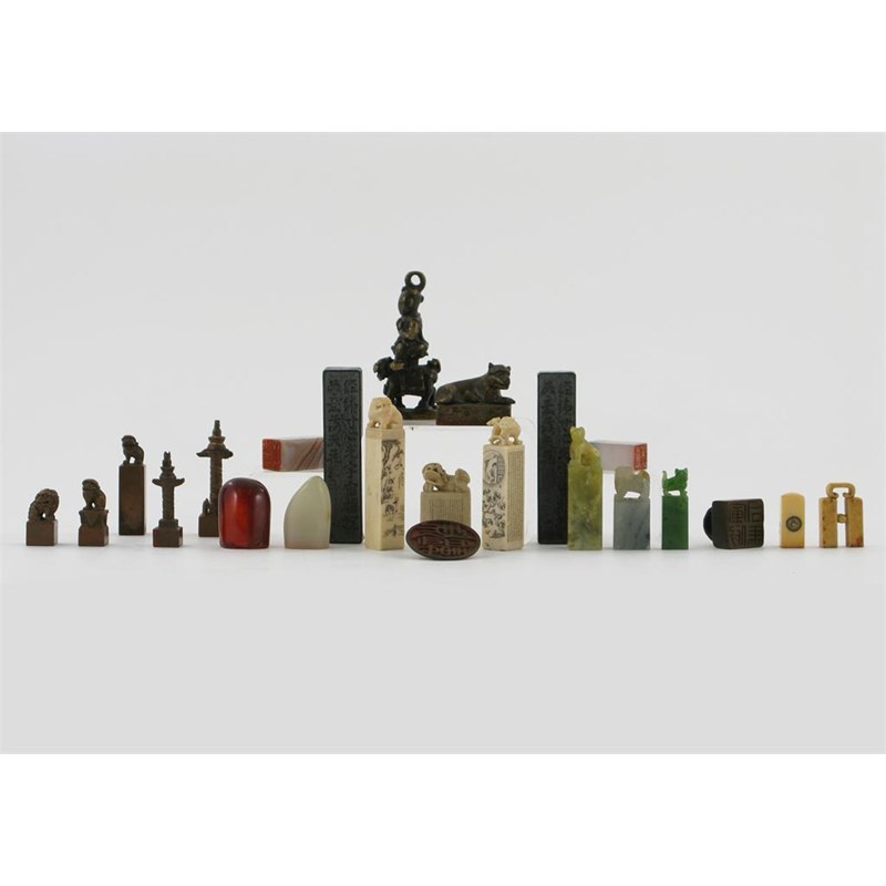 A large collection of Chinese seals, comprising; thirty-one in bronze and other metals, seventeen in jade and other stones, eleven in ivory, six in other materials and a bronze prunus spray together with a collection of sixteen ink blocks. (a lot)